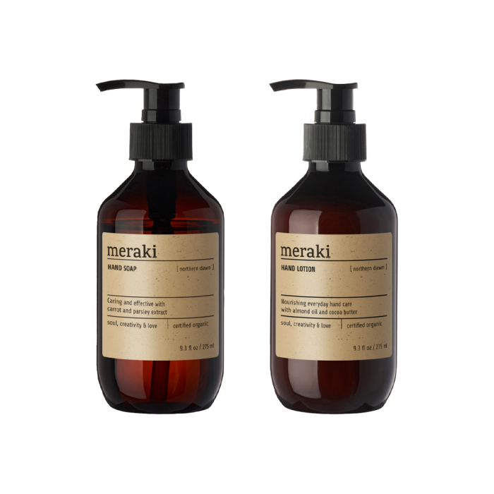 Northern Dawn gaveæsken fra Meraki indeholder en håndsæbe og en håndlotion i de klassiske brune pumpeflasker med 275 ml i hver. Serien er økologisk certificeret efter COSMOS-standarden af Ecocert og kendetegnet ved en frisk duft, hvor appelsin møder varme trænoter og en blød balsamisk undertone. Håndsæben renser huden mildt og indeholder udtræk af gulerod og persille, som giver en blid, naturlig pleje. Lotionen har en cremet konsistens og er beriget med mandelolie og kakaosmør, der efterlader huden velnæret og smidig. Sættet er oplagt som værtindegave, mandelgave eller som en omsorgsfuld gestus til én, du ønsker at forkæle. Et velafbalanceret og velduftende sæt til både køkken og badeværelse.