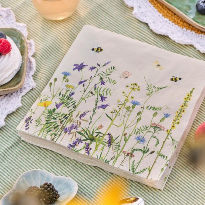 Det summer af liv på blomsterengen med sommerfugle og bier. Ligeså på disse sommerservietter fra Ib Laursen. Dæk et smukt bord til havefesten eller på en dejlig sommerdag med servietter i glassene.