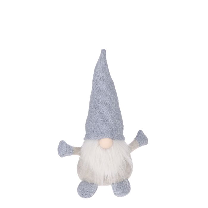 Sød nissegnom med ulden mave i gråhvid farve og velourblød hat i gråblå farve. Nissegnomen står solidt på fødderne, og der er ståltråd i huen, så den kan bøjes eller sættes som man vil.