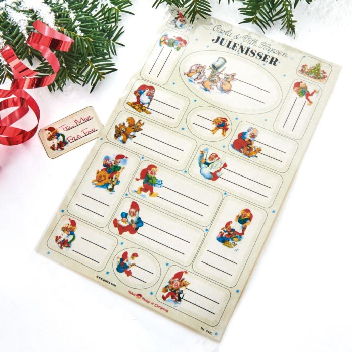 Klæbegavemærker med Vilhelm Hansens nissedesign. Der er to ark med klæbegavemærker i en pose lige klar til at sætte på julegaverne.