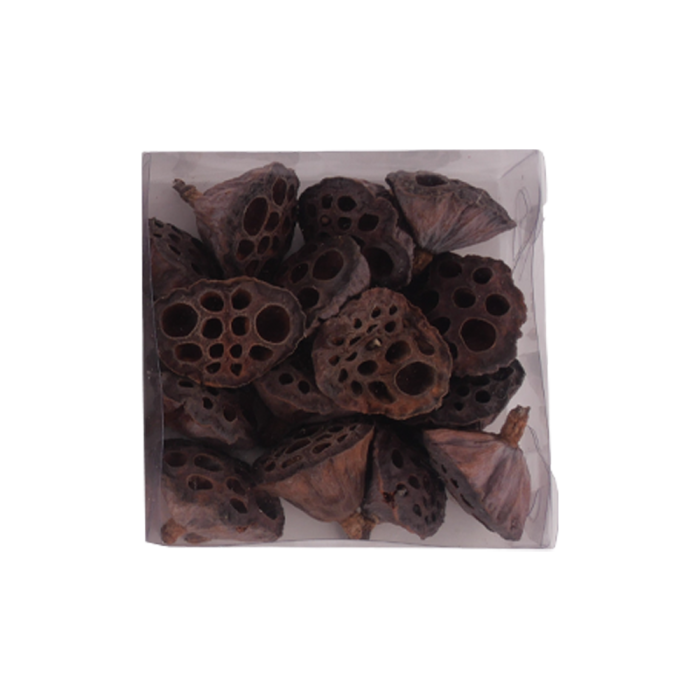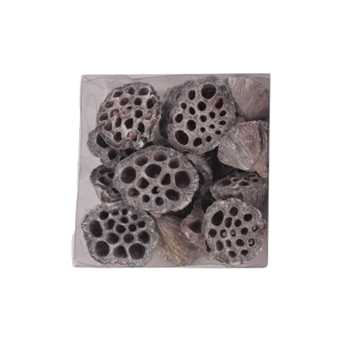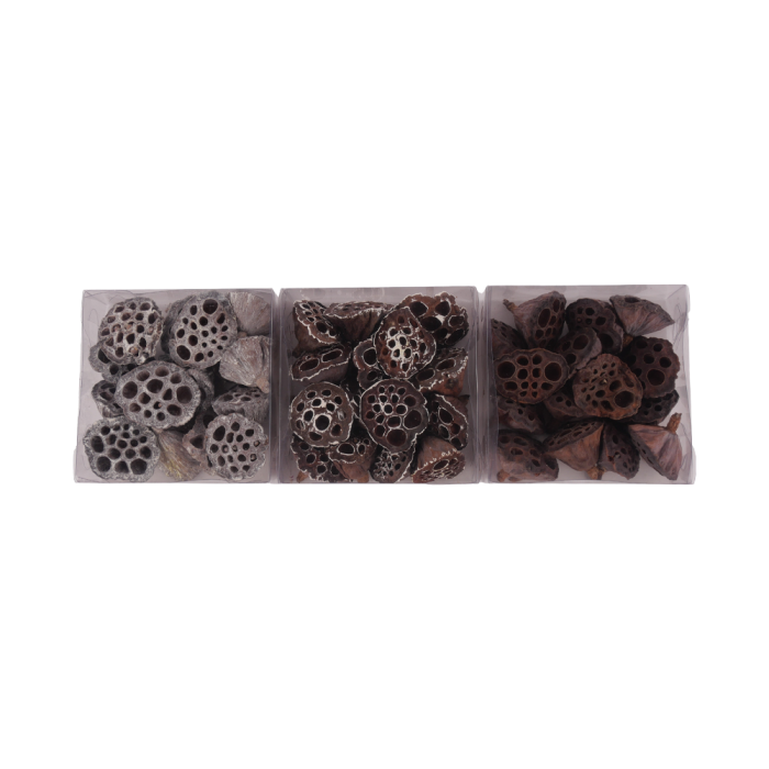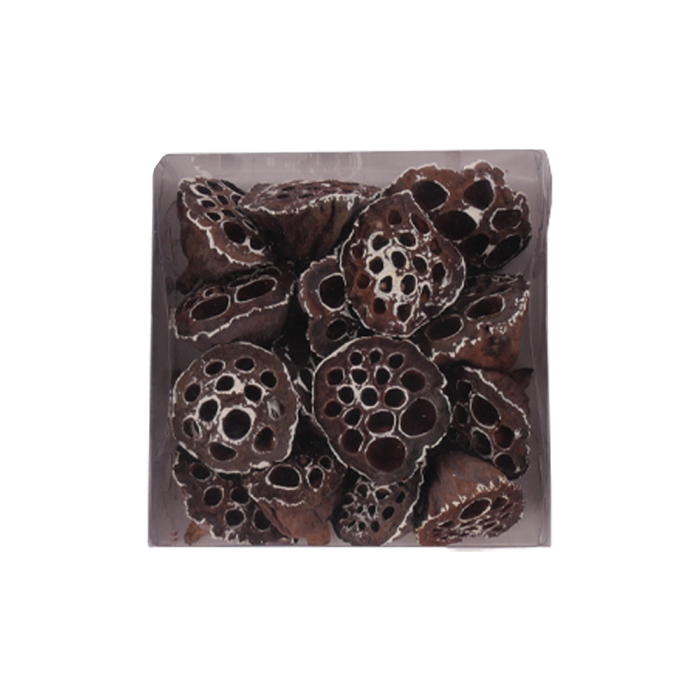 Lotusfrøskaller med wire til brug i dekorationer, kranse mv. Fås i tre forskellige varianter: "frostede", med lidt "sne" eller naturlige brune. Måler mellem 3 cm og 5 cm i diameter.