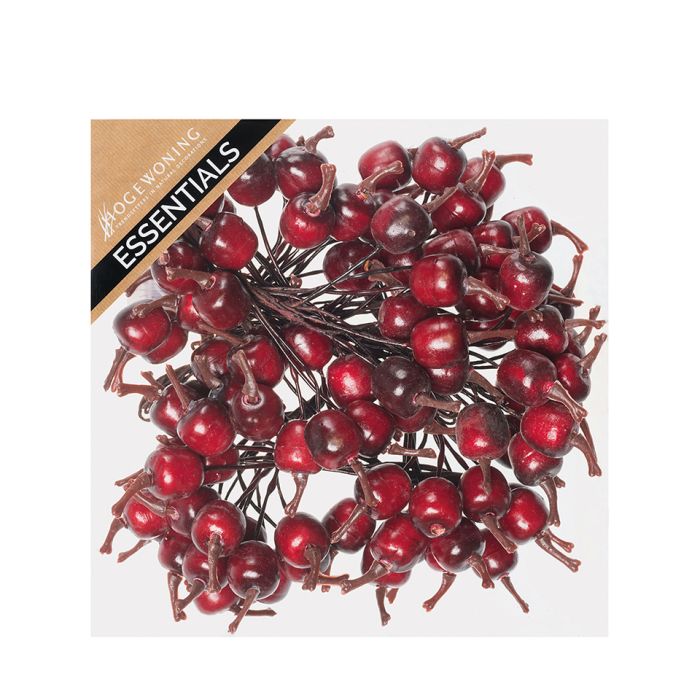 Røde miniæbler på wire. Bittesmå, røde miniæbler med lille stilk og en metalwire til at stikke ind i kransen, oasissen, leret, jorden mv. Æblerne sidder i klynger med 12 stk. Der er 8 klynger i en æske.