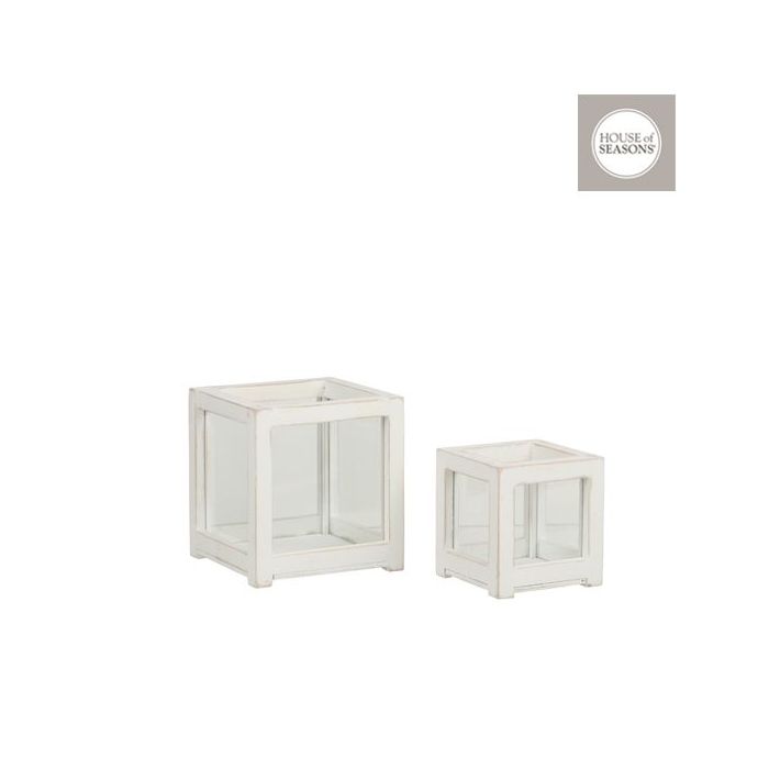 Firkantede glas med hvide kanter i sæt med et stort og et lille. Kun fantasien sætter grænser for, hvad der kan komme i glassene. Prøv fx med stearinlys, farvestrålende påskeæg, små glitrende julekugler, naturlige kogler eller med små lyskæder.