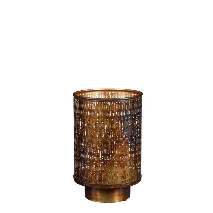 Slank, høj, Harmony fyrfadsstage i antik guldfarvet metal med hulmønster rundt om. Hyggeligt og afdæmpet lys.