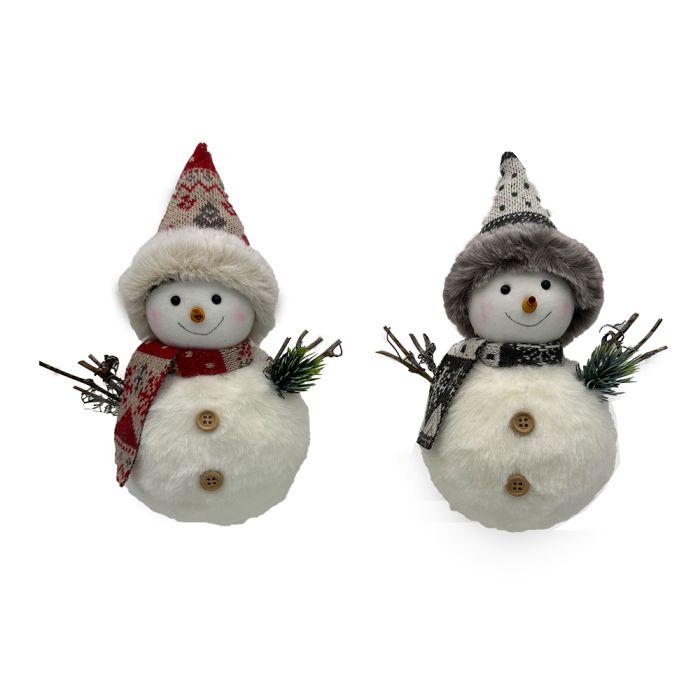 Denne søde og bløde snemand er klar til at sprede vinterglæde med sit venlige smil og hyggelige udtryk. Den er iført en strikket tophue med blød pelskant, matchende halstørklæde og fine grenarme, som giver figuren et charmerende, naturinspireret look.