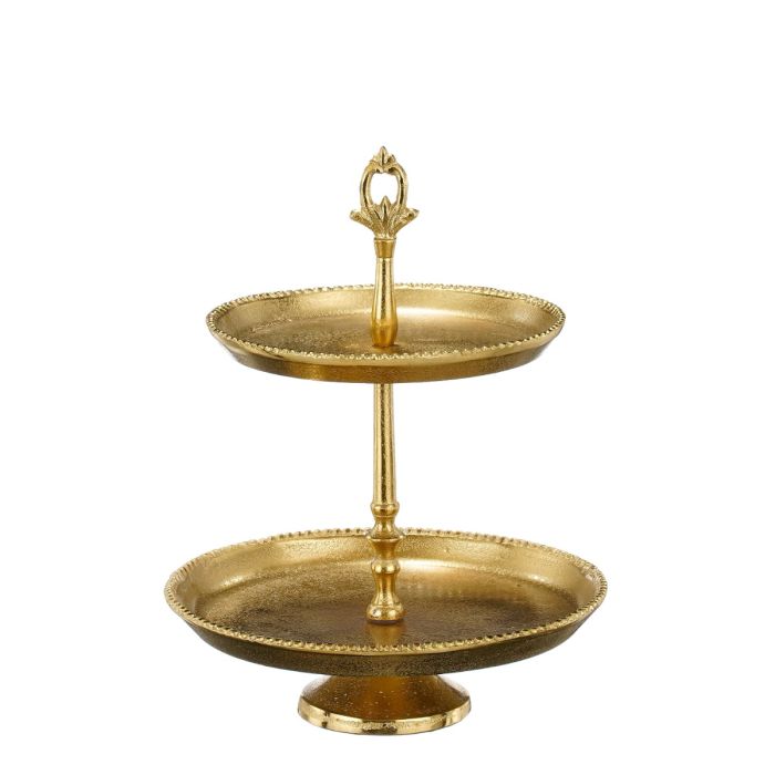 Et stilfuldt etagefad fra Mica Decorations, hvor traditionelt design møder romantisk elegance. Fadet er udført i genanvendt aluminium med en varm guldfarvet finish og har to etager, der giver plads til kager, snacks eller små delikatesser.Kanterne er med rillet mønster, og fadet er med lille fod. Øverst prydes opsatsen med dekorative detaljer. Fadet vil være en festlig og iøjnefaldende detalje fx på julebordet, til bryllupsreceptionen, fødselsdagen eller barnedåben.