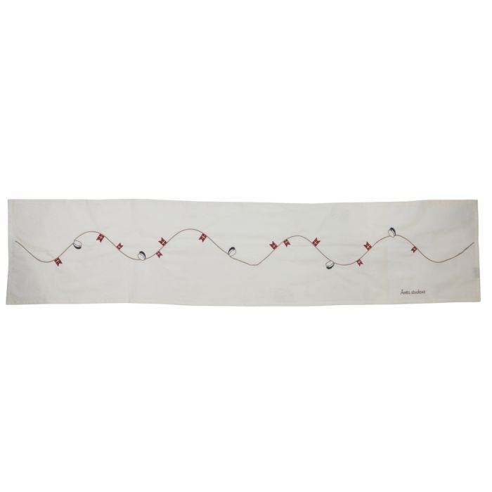 Festlig, hvid bordløber til studentergildet med små broderede dannebrogsflag og blå studenterhuer på fra Speedtsberg.