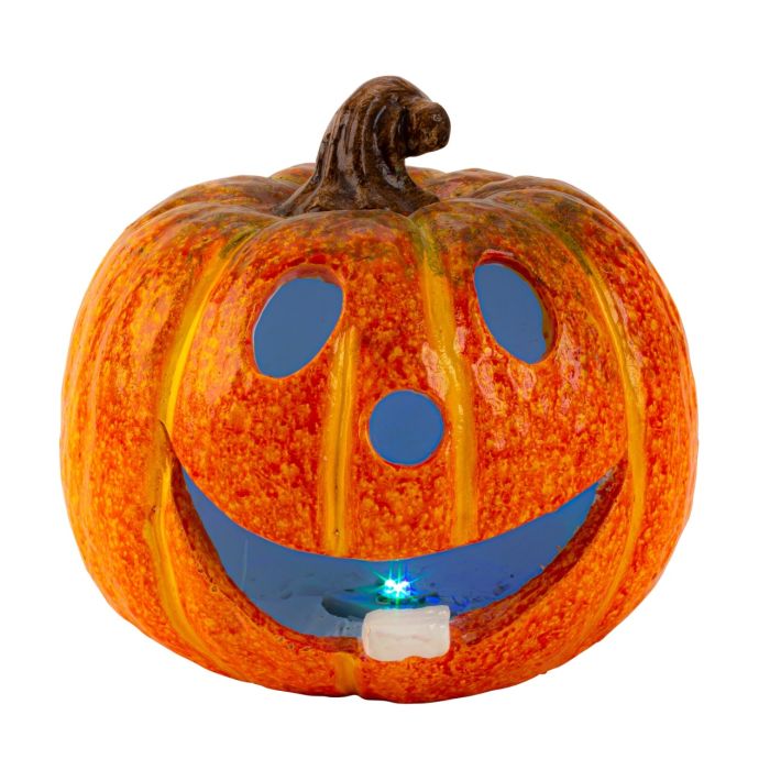 Græskar med farveskiftende lys. Græskarret er med rigtig græskarstruktur i overfladen og huller, hvor det farveskiftende LED-lys rigtig kan skinne ud igennem.