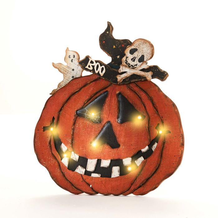 Græskarhoved i træ med LED-lys. Stående trægræskar med skelet på toppen og 7 LED-lys.
