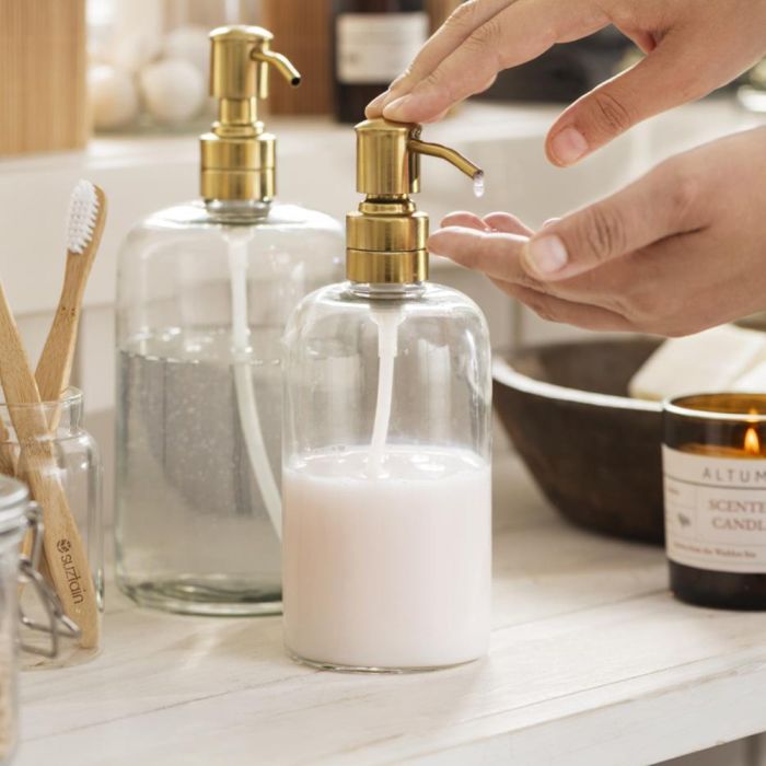 Sæbedispenser i klart glas med messingfarvet pumpehoved i rustfrit stål fra Ib Laursen. Sæbedispenseren er med særdeles robust pumpehoved, der sørger for nem dosering. Sæbedispenseren er en fin detalje på badeværelset, og den kan med fordel også fyldes med creme, shampoo mv. for at skabe et ensartet og stilrent look.