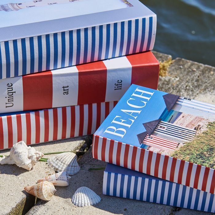 Æske/bogsæt fra Speedtsberg med to æsker i forskellige størrelser Begge æsker er i blå/hvide farver med sommerstemning og fyrtårne som motiv på forsiden og lækker kvalitet indvendig. Heri kan der lægges og opbevares alt fra bøger til spil. Bogæskerne kan både stå oprejst på reolen eller lægges dekorativt på fx et bord. Opbevaringsæskerne fås med flere forskellige motiver.