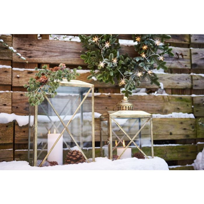 Dekorative lanterner i guldfarvet metal med glaspartier og elegante krydsdetaljer fra Speedtsberg. Lanternerne har et elegant udtryk, der tilfører varme og hygge til boligindretningen året rundt. Fyld dem med mos, kogler, muslinger eller årstidens pynt for et naturligt look, eller brug dem med levende lys for at skabe en stemningsfuld atmosfære både ude og inde.