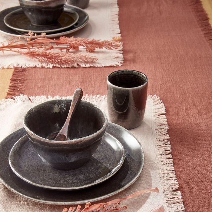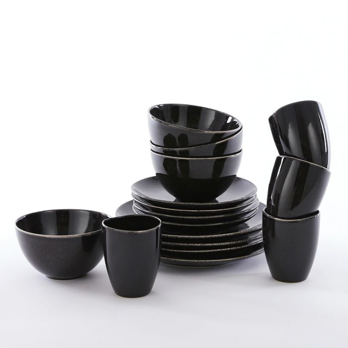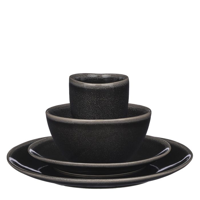 Tabo spisestel med 16 dele til 4 personer i sort nuance fra Mica Decorations. Håndlavet keramikstel, hvor ingen dele er helt magen til hinanden. Et robust spisestel med flotte, rustikke overflader. Sættet består af 4 middagstallerkner, 4 frokosttallerkner, 4 skåle og 4 krus.