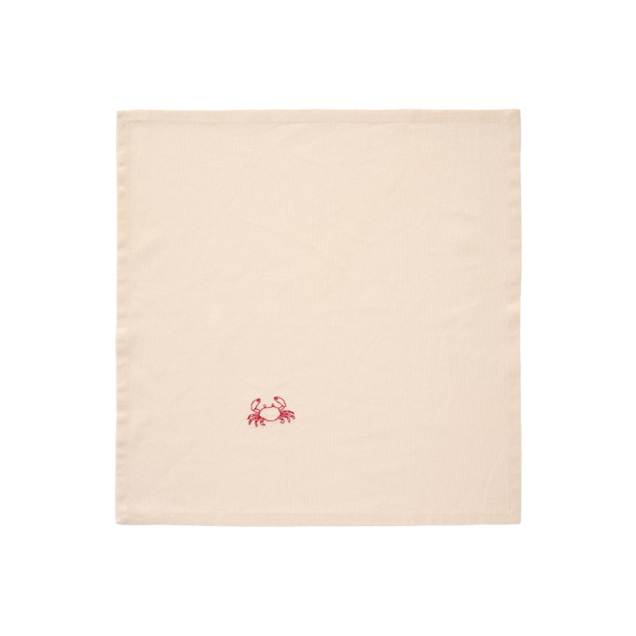 Stofserviet i butter cream nuancen fra Ib Laursens Atlantis serie med broderet, rød krabbe som motiv på. Stofservietten er i lækker, blød kvalitet og med et moderne og enkelt design. Slå en løs knude på stofservietten og gør borddækningen ekstra indbydende med et strejf af sommer og hav.