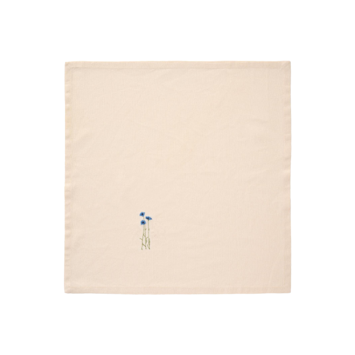 Stofserviet i butter cream nuancen fra Ib Laursens Flora serie med broderede, blå kornblomster på. Stofservietten er i lækker, blød kvalitet og med et moderne og stilfuldt design. Slå en løs knude på stofservietten eller sæt en servietring rundt om, og gør borddækningen ekstra poetisk og sommerlig.
