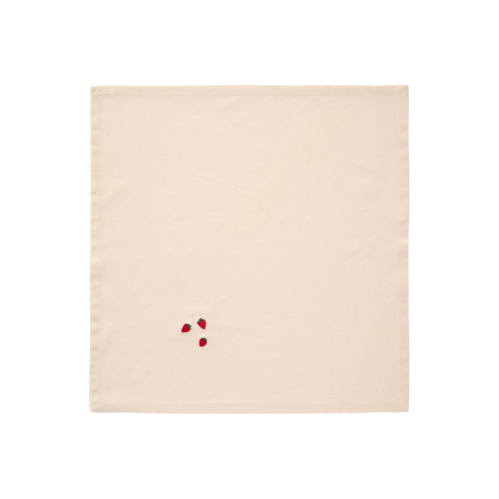 Stofserviet i butter cream nuancen fra Ib Laursens Summer Vibes serie med små, broderede jordbær på. Stofservietten er i lækker, blød kvalitet og med et moderne og enkelt design. Slå en løs knude på stofservietten eller sæt en servietring rundt om, og gør borddækningen ekstra festlig og sommerlig.