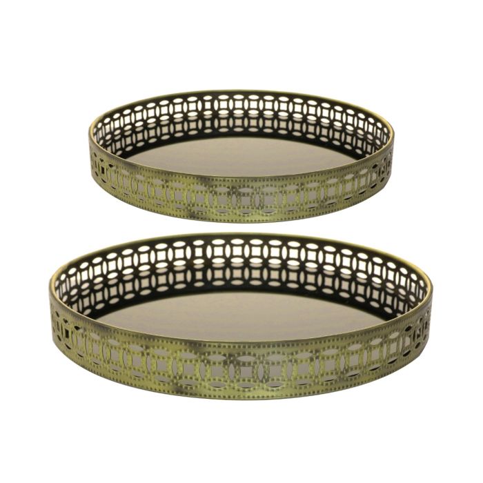 Sæt med to guldfarvede og sorte bakker med spejlbund. Kan også bruges som lysfade, hvor spejlene giver en flot effekt.