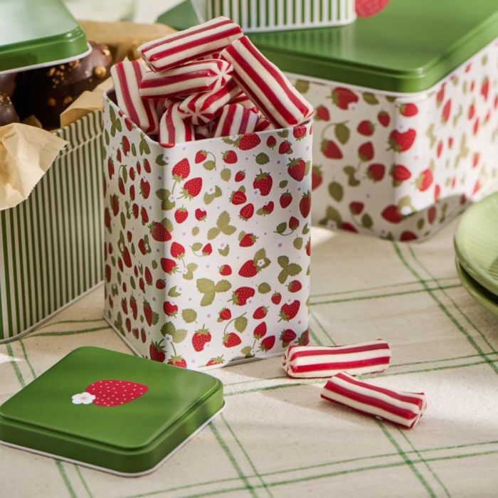 Firkantet flad dåse med solmodne jordbær og hvide jordbærblomster som motiv samt grønt låg med et enkelt jordbær på som dekoration. Dåsen er fuldfarvet off white indeni. Ideel til opbevaring af fx bagværk. Dåsen er fra Ib Laursen og fås i flere størrelser.