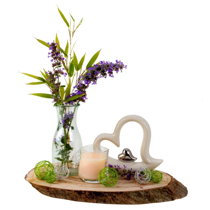 Lille træskive med årringe og bark på kanten. Velegnet som fx dekorationsfad eller lysfad.