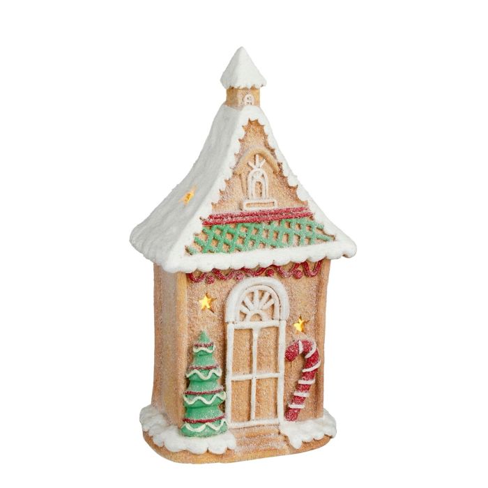 Honningkagelignende hus med hvide "glasur" detaljer, grønt juletræ og stribet sukkerstok ude foran. Huset er med LED-lys indeni. Kan både bruges som en del af julelandskabet eller blot pynte selv i fx vindueskarmen eller foran hoveddøren.