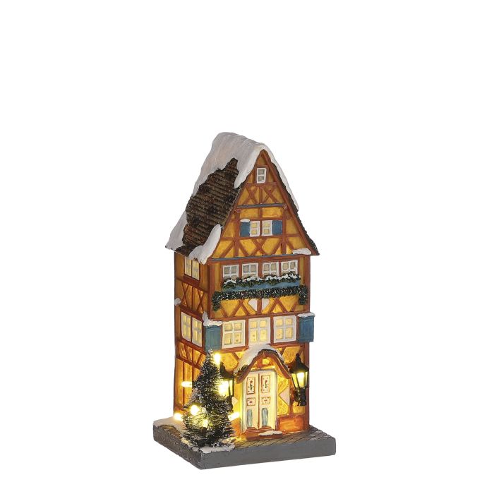 Tysk gult hus med bindingsværk og sne på taget. Der er lys i huset, på træet og i lamperne. Huset er en del af de nye tyske huse tilhørende Schneewald-serien.