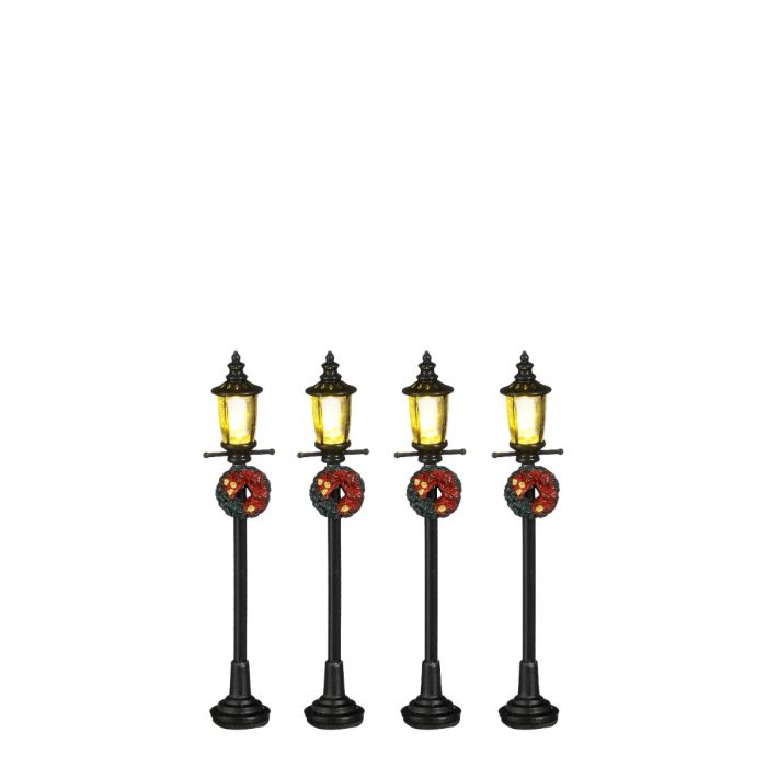 Fire sorte gadelygter pyntet med julekranse på. Lygterne sidder på samme ledning. Giver en hyggelig belysning i julelandskabet.