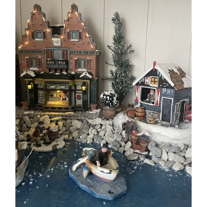 Smalt byhus i hollandsk stil med fiskehandler i stueetagen. Der er kig ind til fiskehandlerens nyfangede lækkerier gennem det store facadevindue. På 1. salen er der skodder ved vinduerne og hyggelig fransk altan. De to takkede kvister skyder højt i vejret og er pyntede med tynd lyskæde med klare lys. Foran butikken er der ligeledes to gammeldags lygter med lys i. Byhuset er en del af Luvilles nye serie af smalle byhuse. Du kan finde flere byhuse her.