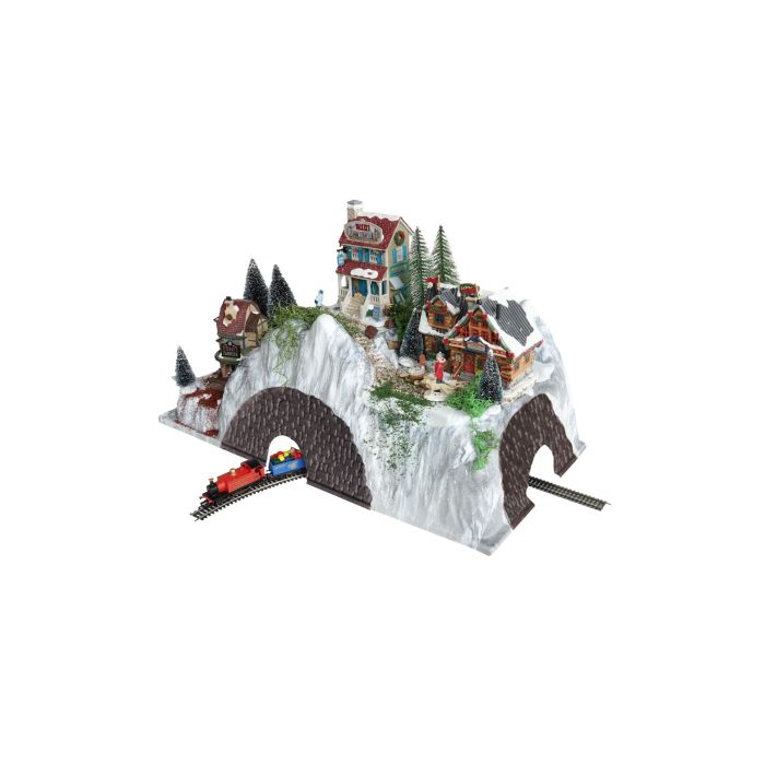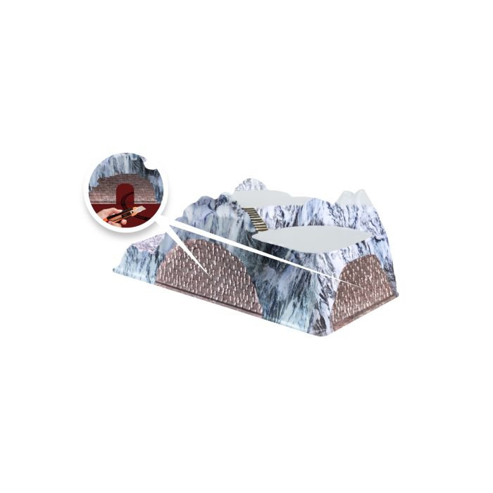 Bjergfundament med mulighed for med en hobbykniv at skære hul til en eller flere togtuneller i ønsket størrelse. Der er plads til 3 huse ovenpå fundamentet. Bjergfundamentet skaber højde i julelandskabet, og gør det nemt at gemme ledningerne væk.