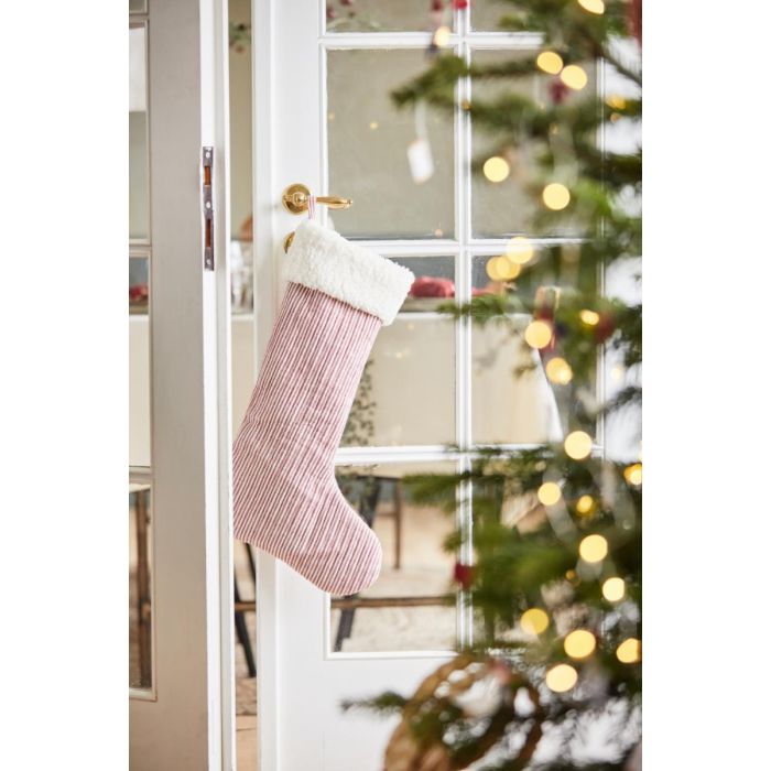 Hyggelig julesok med røde og hvide mælkedrengestriber og kunstig, bred pelskant foroven. Ideel til at fylde med små gaver, søde hilsner eller andre hyggelige overraskelser gennem hele december. Julesokken er fra Ib Laursens Stillenat-julekollektion. Den fås også med brune og hvide mælkedrengestriber.