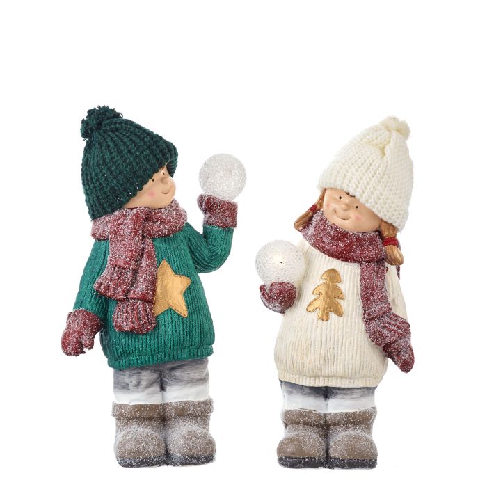 Vinterbørn store findes i 2 varianter enten dreng eller pige. Begge børn er iklædt varmt vintertøj med snedrys. I hånden har de en snebold med lys i. Tåler let frost.