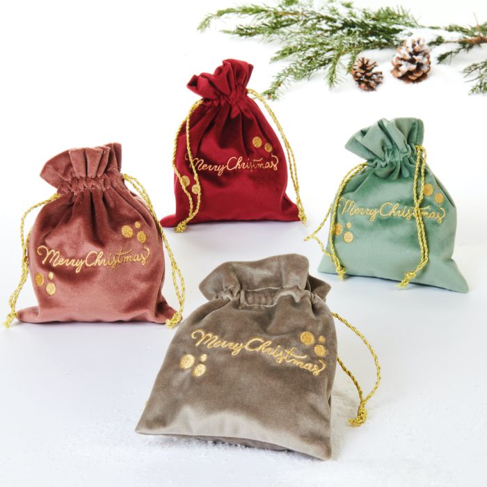 Gavepose i velour med "Merry Christmas" skrevet på. Gaveposerne har et lille bånd, som lukker poserne til. Gavepose i velour findes i 4 varianter i farverne; mint, grå, rød og gammelrosa.
