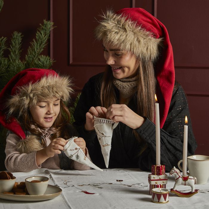 Hvid dug med broderede grangrene med kogler og julemotiv på. Juledugen er en hyggelig tradition på julebordet. Dugen er fra Speedtsbergs serie med juleduge og juleservietter.