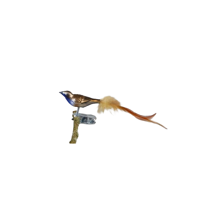 Halen består af ægte fjer i brune toner, og den lange, slanke form tilfører fuglen et elegant og næsten svævende udtryk, når den placeres på en gren eller i en dekoration. Med en længde på 13 cm inklusive den lette fjerhale er blåhalsen en mindre fugl, der passer særligt godt til finere detaljer i juletræet, kranse eller små vinterlige opstillinger.