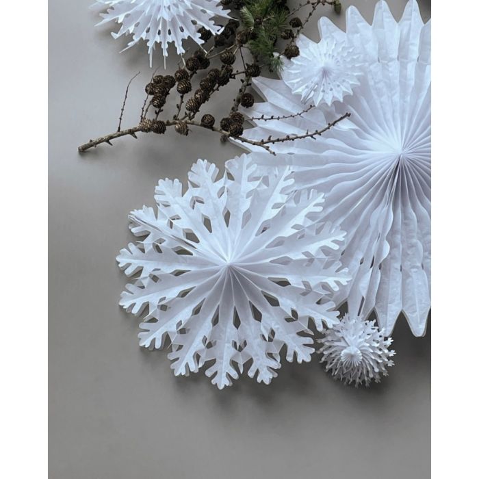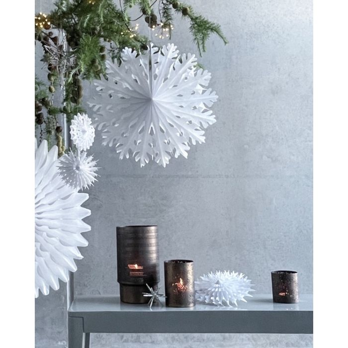 Skab et elegant og vinterligt udtryk med denne håndlavede hvide papirvifte fra House Doctor. Den fine pynt minder om snefnug i sin form og passer smukt i vinduet, hængende fra loftet, på væggen eller en gren. Lad den udfolde sig og sprede en rolig og naturlig julestemning i hjemmet.