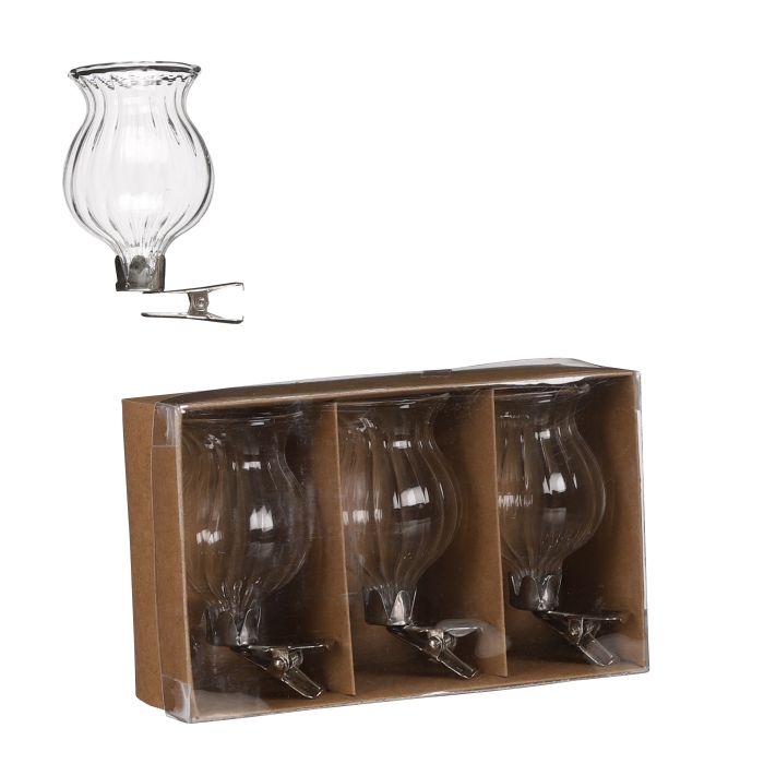 Glasvaser på klips med riller. Fine vaser med klips, så de er lige til at sætte på en gren eller lignende. Man kan både komme lys, blomster eller juleslik i vasen. Måske har du endnu flere ideer!