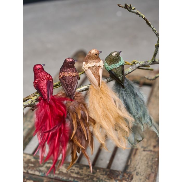 Med sin glitrende krop er denne fugl et smukt blikfang på grene, i kranse, dekorationer eller på juletræet. Fuglen har dekorative, buskede halefjer i ravfarvede nuancer og fine perledetaljer, der tilfører et elegant og eksklusivt udtryk. Den praktiske metalklips gør det nemt at fastgøre fuglen, hvor du ønsker det. Den er en del af Speedtsbergs serie af pynt med klips og fås i flere forskellige farver.