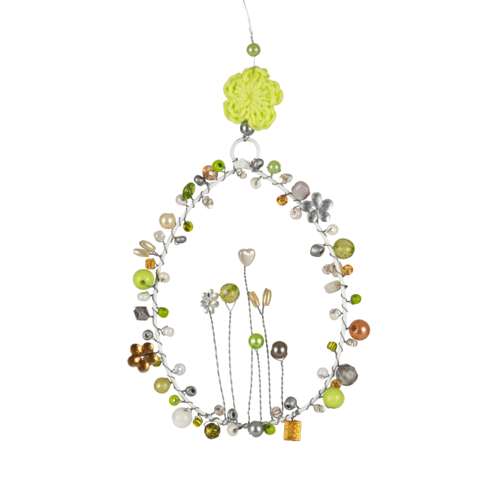 Dette æggeformede påskeophæng kombinerer fine materialer og afdæmpede farver i en dekorativ helhed, der emmer af forår. En let metalramme danner æggets form og er dekoreret med perler i varierende størrelser og nuancer, som tilsammen skaber et levende, men roligt udtryk. Farvespillet er harmonisk og giver ophænget karakter uden at virke tungt.
