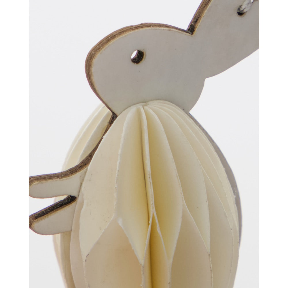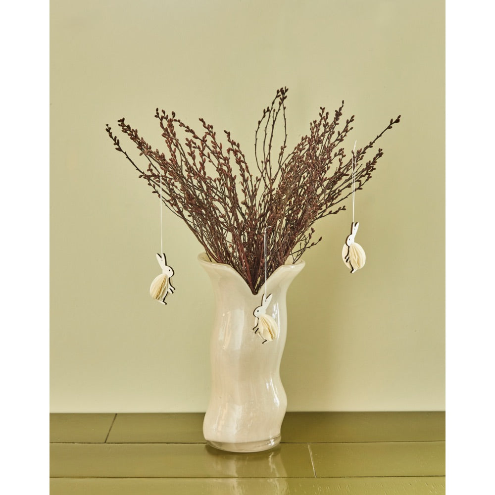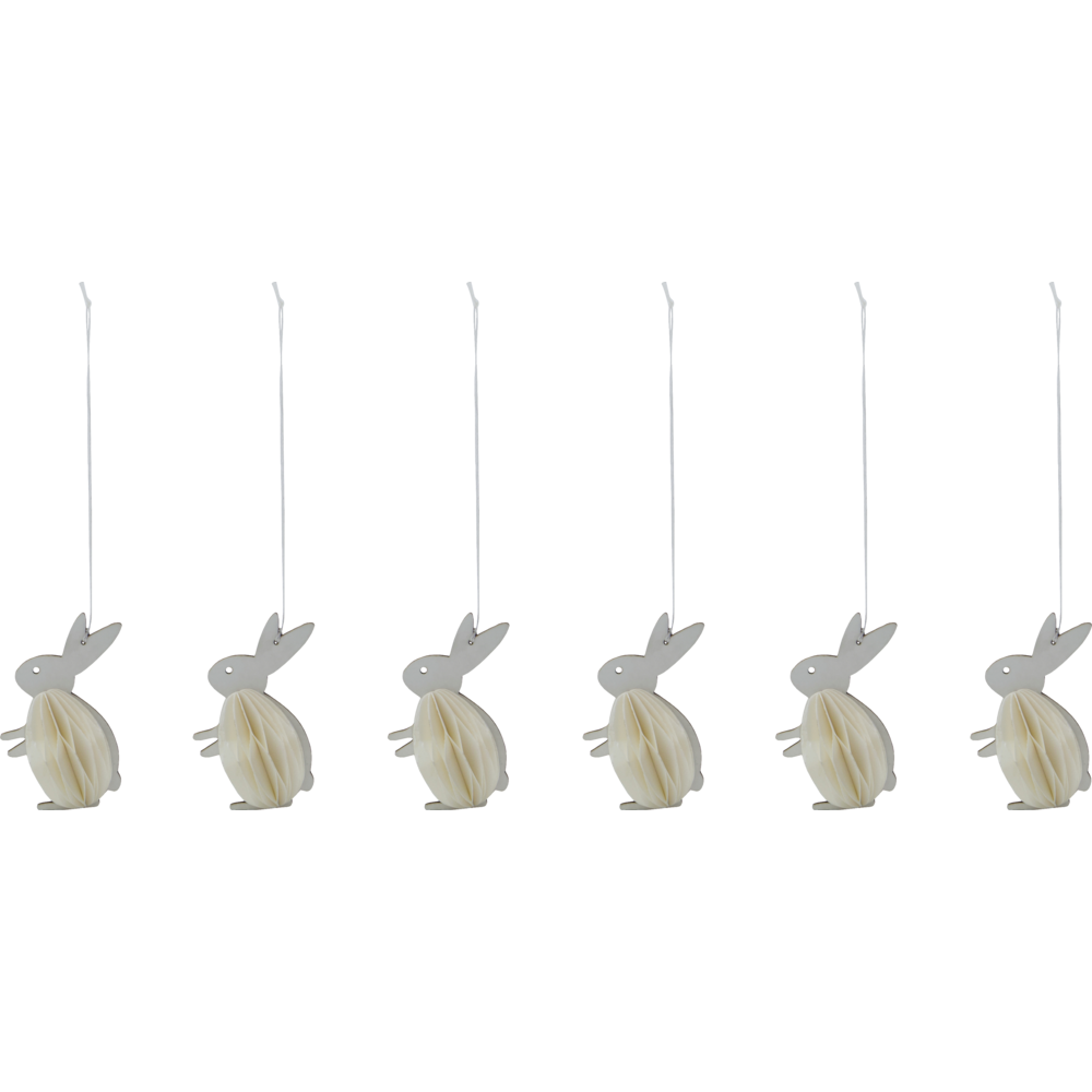 Sættet består af 6 påskeharer i en smuk off-white nuance, der passer ind i en nordisk og stilren påskeindretning. Den fine papirkonstruktion skaber struktur og lethed, mens formen tilfører et moderne twist til den klassiske påskehare.