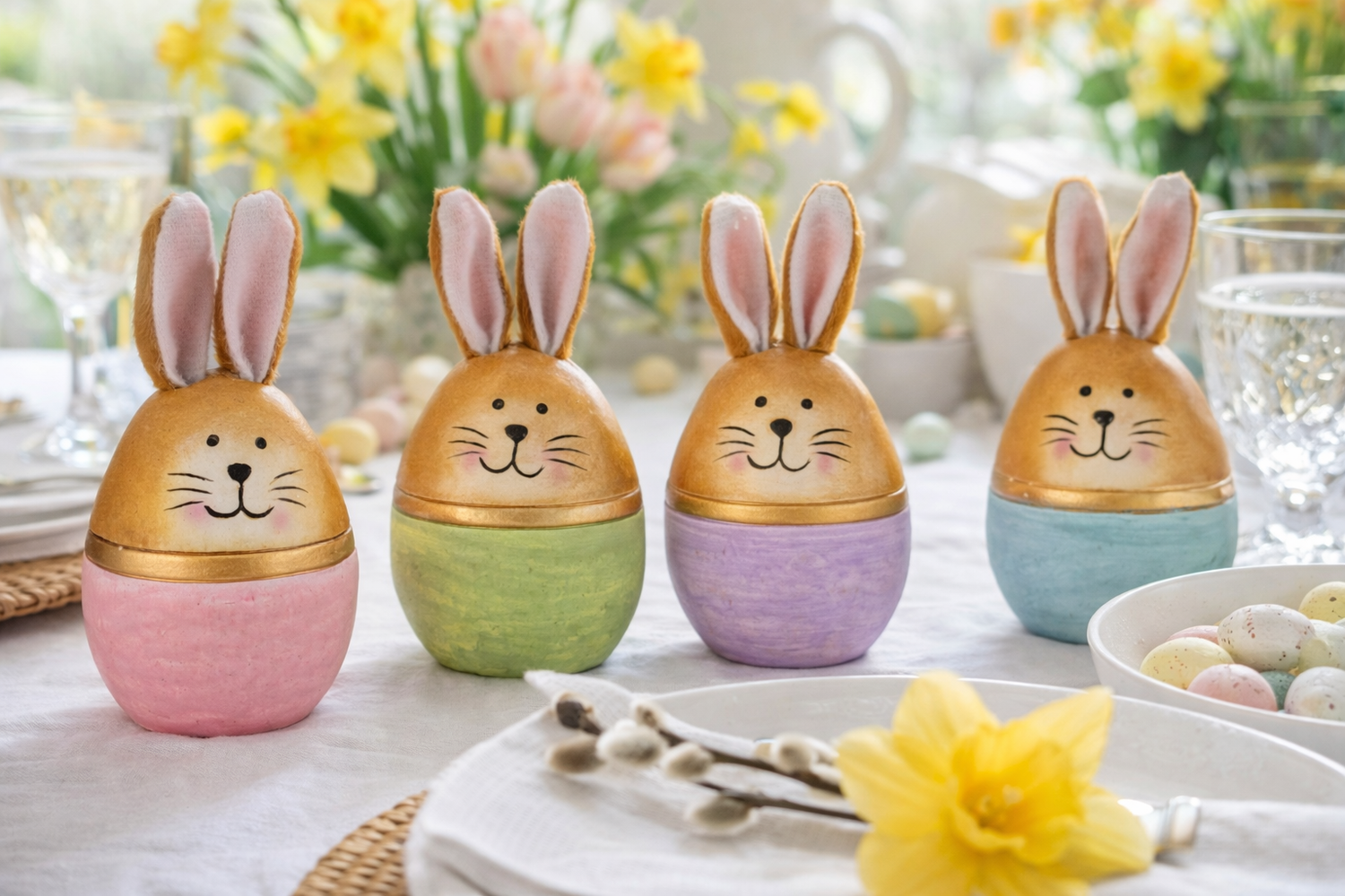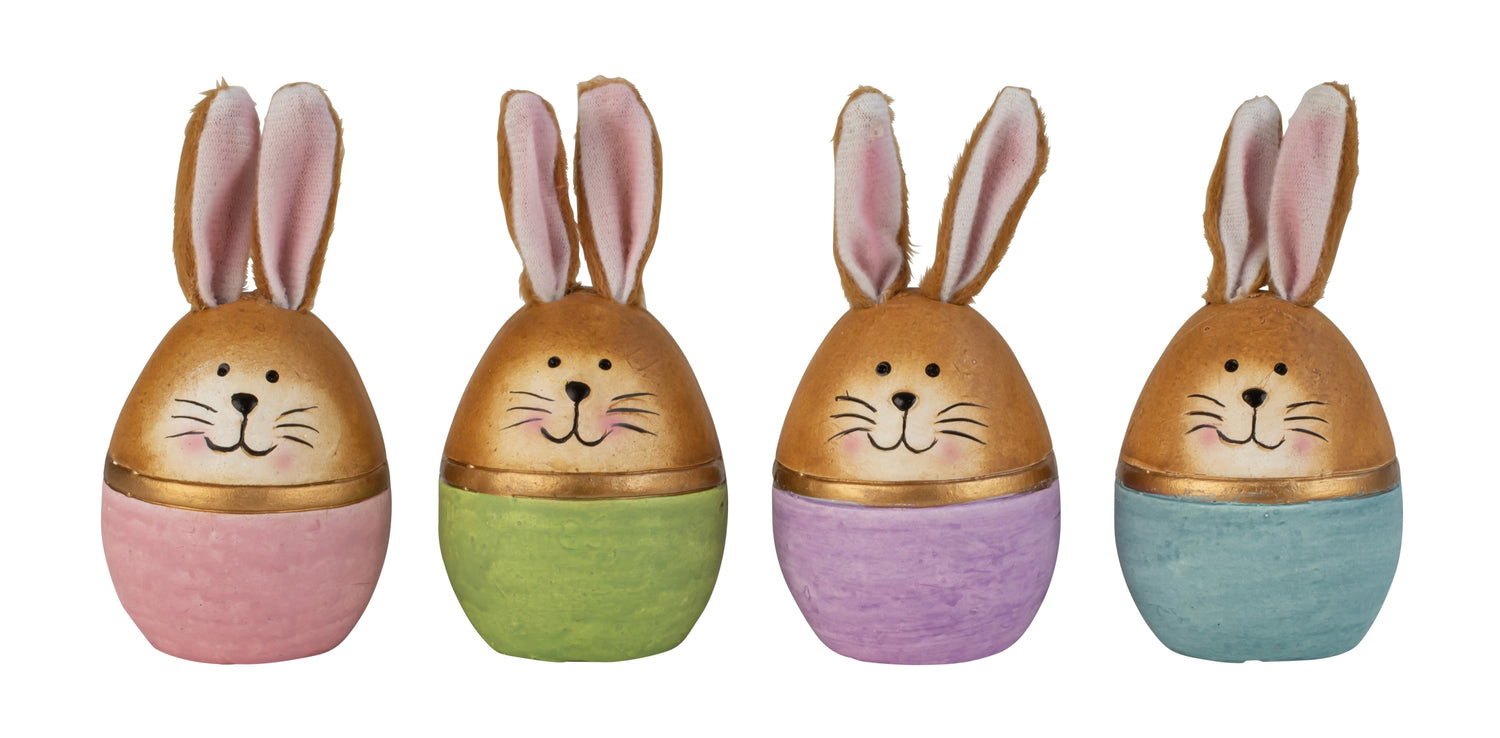 De små harer har milde ansigter med fine, håndmalede træk og varme kinder, som tilfører et hyggeligt og indbydende præg. De er ideelle som bordpynt på påskebordet, hvor de kan stå mellem servietter, æg og forårsblomster, men fungerer også smukt i mindre påskedekorationer sammen med løgplanter, mos og naturmaterialer.