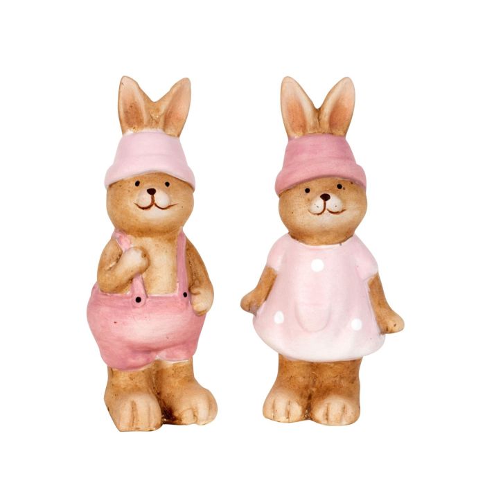 Stående påskeharer, som bringer en let og lys stemning ind i hjemmet med deres bløde pastelfarver og rolige smil. Klædt i lyserødt tøj og små hatte udstråler de forårsglæde og passer perfekt ind i sæsonens pynt, hvor lyse nuancer og fine detaljer får lov at fylde.