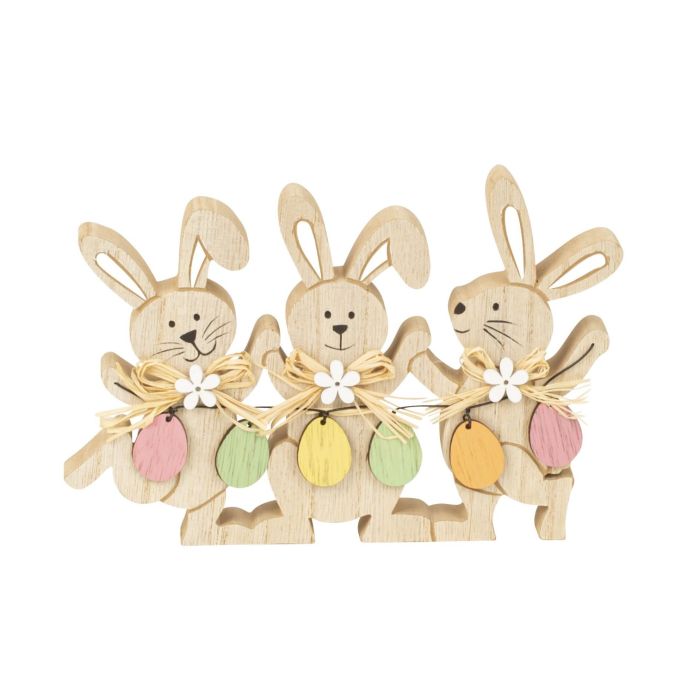 Tre smilende påskeharer i træ står side om side og spreder forårsglæde med deres lette og livlige udtryk. De ser næsten ud som om de danser sammen, mens de holder en lille guirlande med farvede påskeæg mellem sig. De små bastsløjfer og blomsterdetaljer giver figuren et fint og naturligt præg, som passer smukt ind i sæsonens dekorationer.