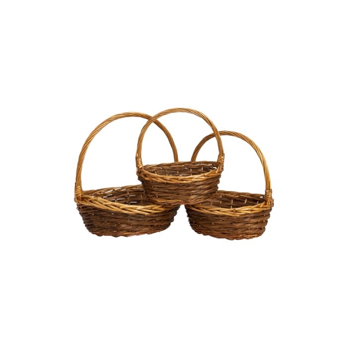 Dette smukke kurvesæt består af tre kurve i mørk pil med elegante, lysere hanke, der giver et harmonisk og naturligt udtryk. Kurvene har et klassisk flettet look og passer godt ind i både landlig og nordisk indretning.