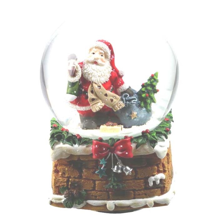 Snekugle Julemand med halstørklæde. Der er blevet strikket hjemme hos julemanden, hvilket har resulteret i et nyt, flot halstørklæde til vinterkulden. I kuglen står julemanden iført halstørklædet og med gavesækken parat. Det nederste af kuglen er pyntet med granguirlander og en stor sløjfe. Bunden er dekoreret som en murstensmur med sne. Når den mekaniske spilledåse i bunden af kuglen trækkes op, spilles julemelodien “O come all ye faithful".