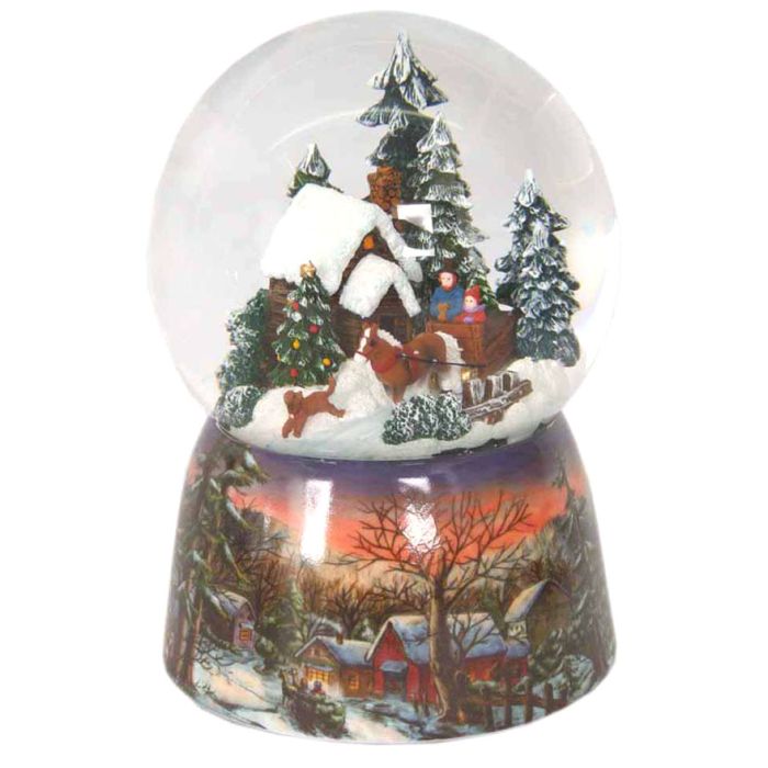 Med den snedækkede bjælkehytte i baggrunden er familien på vej af sted i hestevognen med hunden løbende foran. Sceneriet kan rotere i kuglen. Snekuglen kan spille melodien "Winter Wonderland".