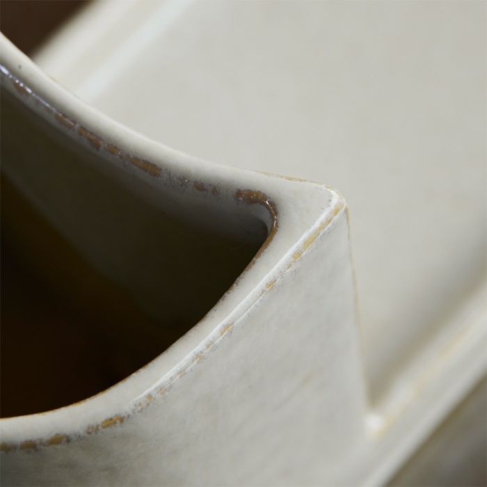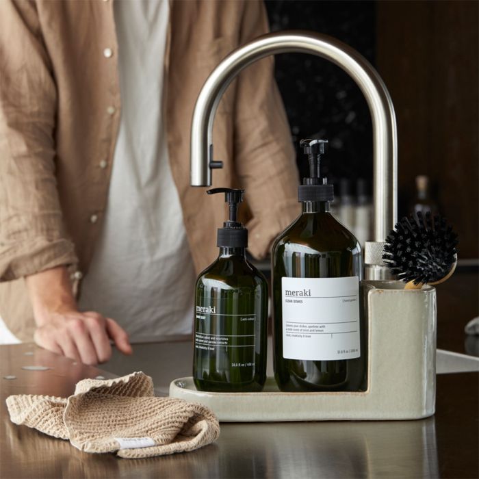 Meraki Datura i denne version giver dig ekstra fleksibilitet ved vasken, da holderen har plads til både en børste og to flasker. Den er fremstillet i stentøj med den smukke shellish grey glasur, som skaber en blød og harmonisk overflade. Formen er gennemtænkt med et separat rum til børsten og en bred flade, der kan rumme to Meraki-flasker eller andre mærker, du foretrækker. Den fungerer lige godt til kombinationer som opvaskemiddel og håndsæbe eller håndcreme og køkkensæbe alt efter behov. Holderen står stabilt på bordet og giver et roligt og samlet udtryk omkring vasken. Materialets tyngde og glasurens fine struktur tilfører en sanselig detalje til både køkken og badeværelse.