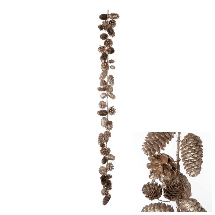 Guldfarvet kogleguirlande med kogler i forskellige størrelser. Meget dekorativ i vinduer og døråbninger.