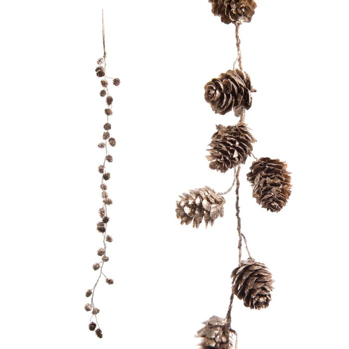 Kogleguirlande med glimtende kogler i farverne: hvid, guld og champagne. Der er ca. 12 kogler på guirlanden.