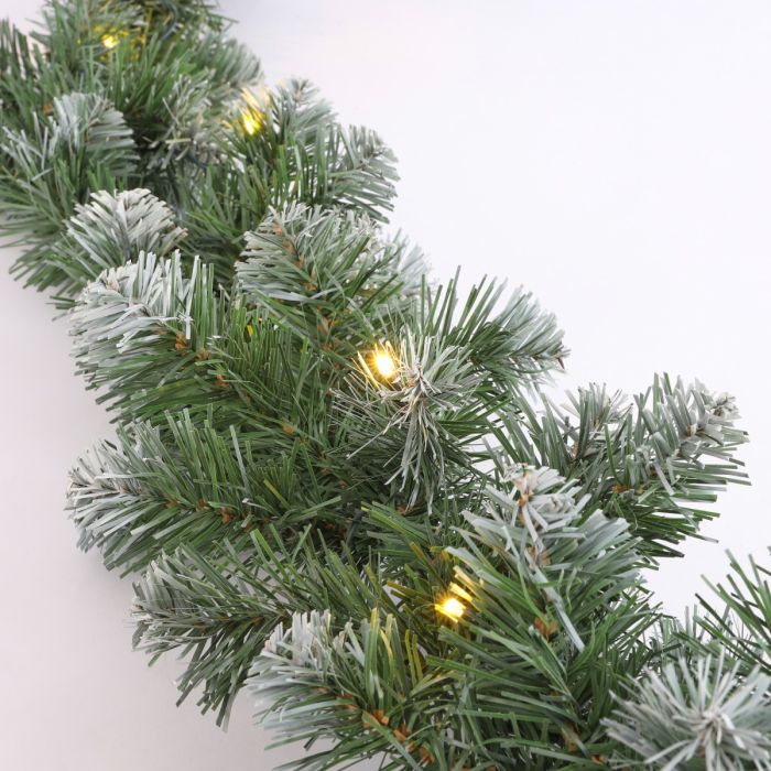 Granguirlande med frost og lys. Granguirlanden er med tætte, grønne nåle med hvid frost på spidserne af nålene. Granguirlanden har 20 LED-lys i varm hvid.
