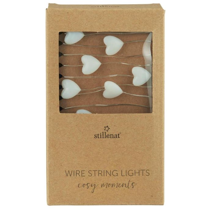 Dekorativ, tynd wire-lyskæde med 40 lysende hjerter fra Ib Laursen. Lyskæden har en udendørs batteriboks med timer, der tænder i 6 timer og automatisk slukker i 18 timer. Perfekt til at pynte det lille juletræ, en kurv, bakke, lanterne eller juledekoration med en hyggelig og varm stemning.