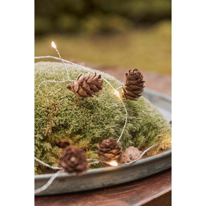 Hyggelig og dekorativ lyskæde fra Ib Laursen. Kæden har 10 små LED-lys og små naturlige kogler, der giver et stemningsfuldt og rustikt udtryk. Den passer perfekt til både efterårs- og vinterpynt og er ideel som en del af juledekorationer på bordet, i vindueskarmen eller i en krans. Brug den til at fremhæve naturens materialer i dine dekorationer, eller lad den lyse smukt op i en lanterne, på en bakke med gran og lys eller som del af din adventspynt.